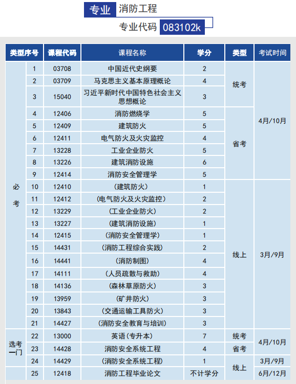 自考消防专业理论课为全国统考,由各省教育考试院组织报名和考试。实践性环节考核和毕业论文(设计)由我校组织报名和考核(答辩)。自考考生的学籍档案由各省教育考试院电子备案管理。凡参加消防工程专业(独立本科段)理论课考试,至少有一门课程取得合格*的考生即获取学籍。